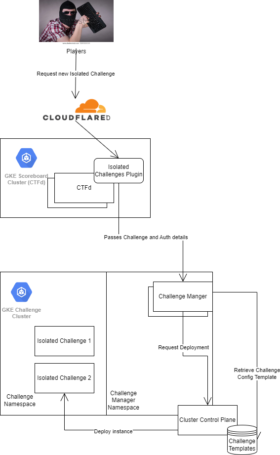 - challenge-manager requests the template from the Kubernetes Control Plane